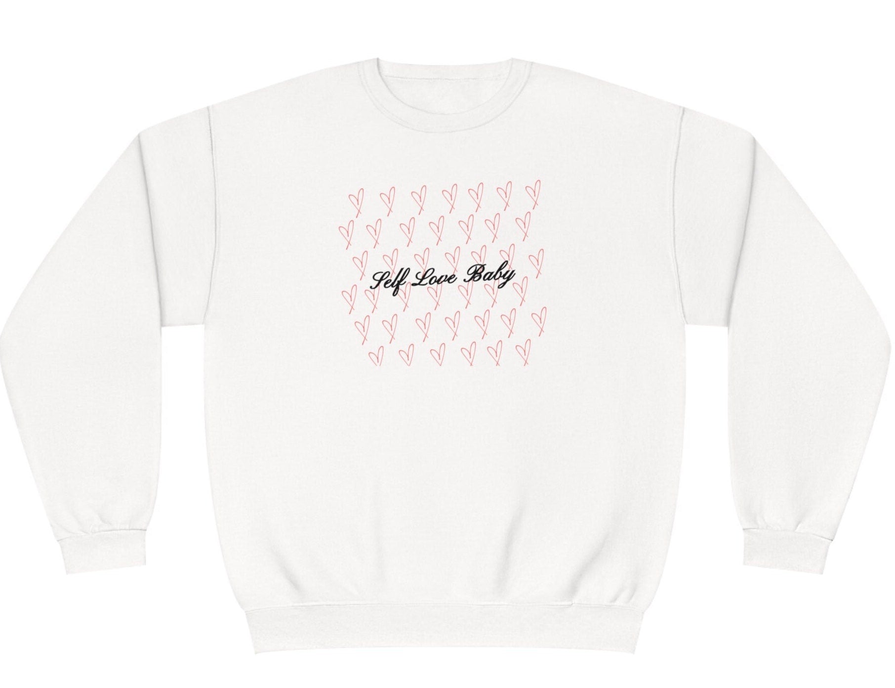Self Love Baby Valentine's Day Crewneck Sweatshirt | Mental Health Awareness Healing Matters Galentine's 2024 Red Hearts Black Script