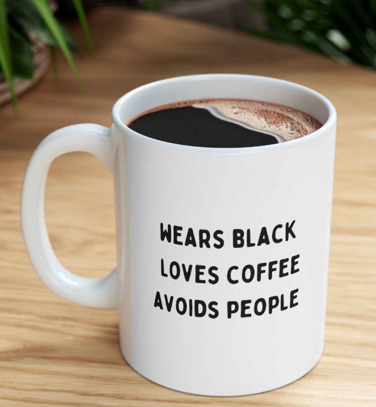 Wears Black Loves Coffee Avoids People 11oz Mug | Moody Say What You Feel Mental Health Ceramic Coffee Tea Mug New Menty Tee Co Fall 2023